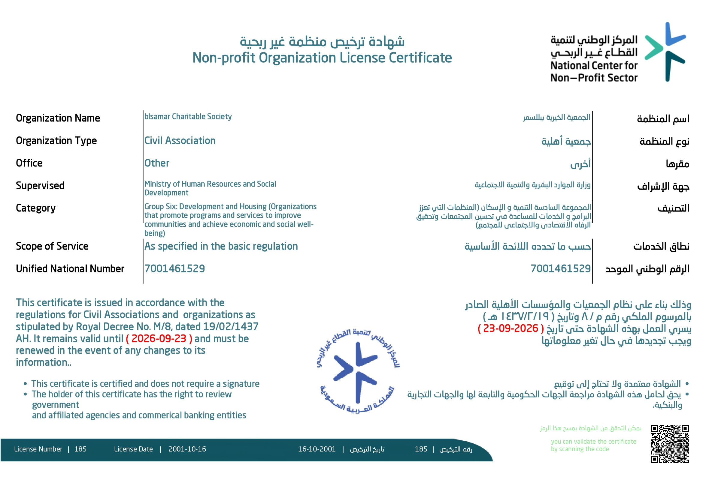 شهادة تسجيل الجمعية